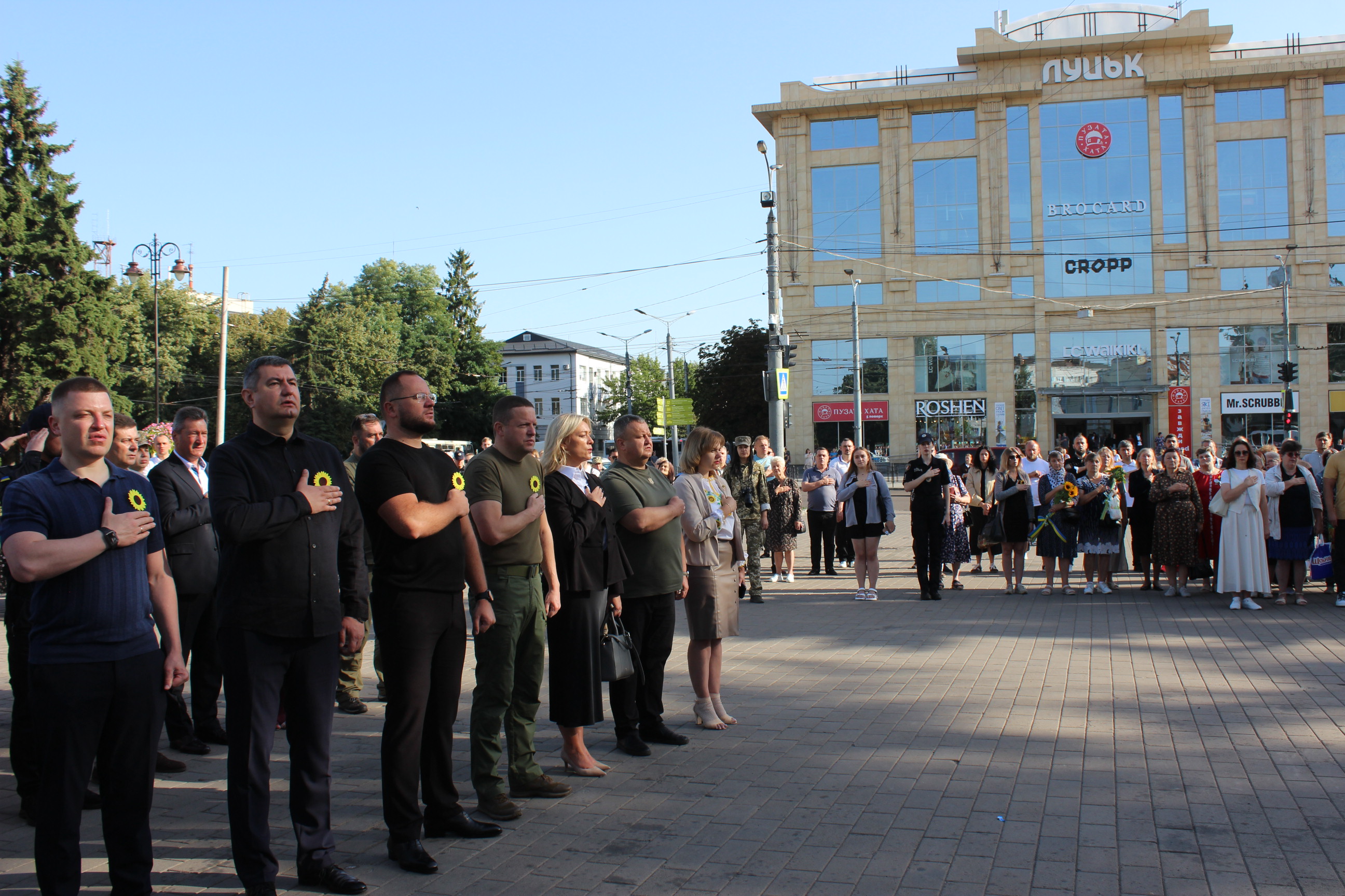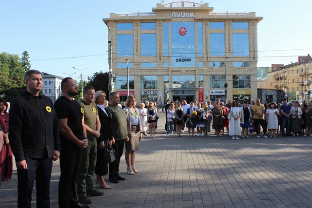 Після хвилини мовчання разом зі всіма квіти до пам'ятного фотостенду поклав перший заступник голови Луцької районної державної адміністрації Сергій Шкода.