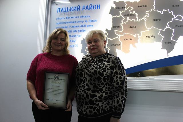 Начальник Луцької районної військової адміністрації Анатолій Костик вручив Подяку Міністерства у справах ветеранів України першому заступнику начальника управління соціальної та ветеранської політики Луцької райдержадміністрації Тетяні Хомич.