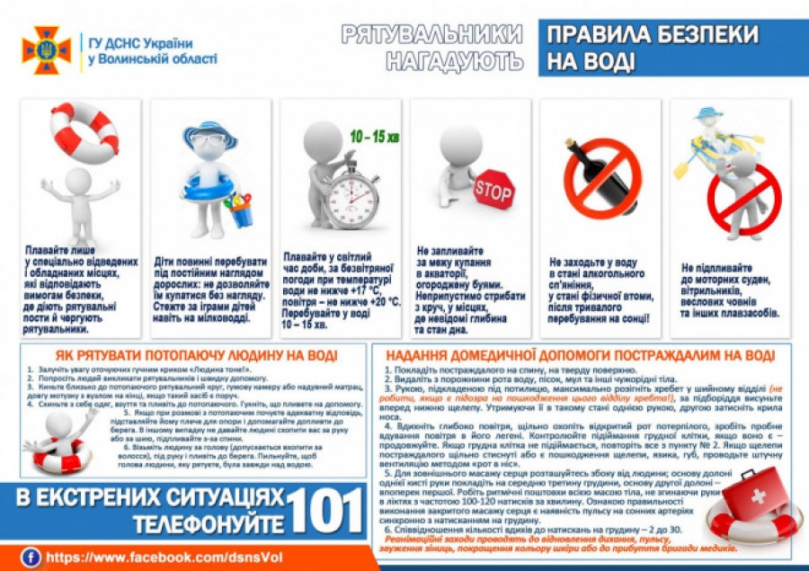 У літній період традиційно значно зростає кількість трагічних випадків на водоймах. Шукаючи порятунку від палючого сонця, люди обирають для відпочинку переважно місця біля води. Тож, аби відпочинок приносив тільки користь і позитивні емоції, волинські рятувальники закликають громадян дотримуватися правил безпеки на воді.