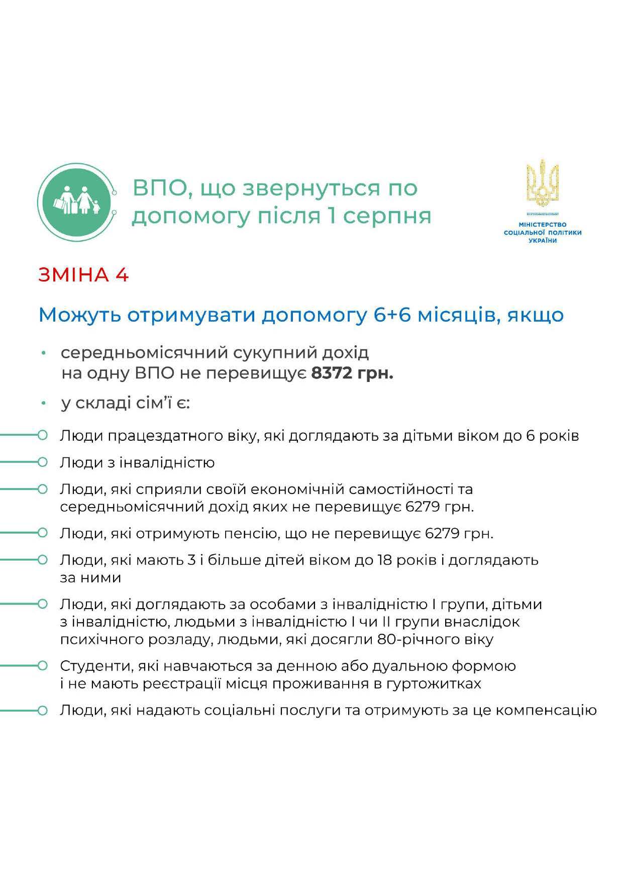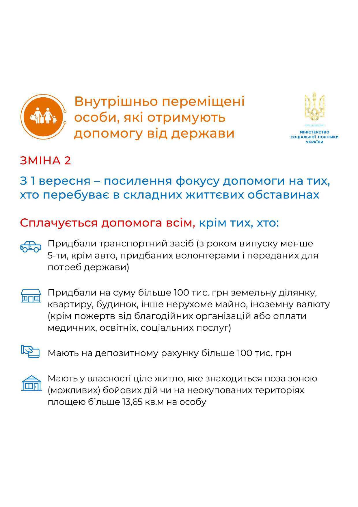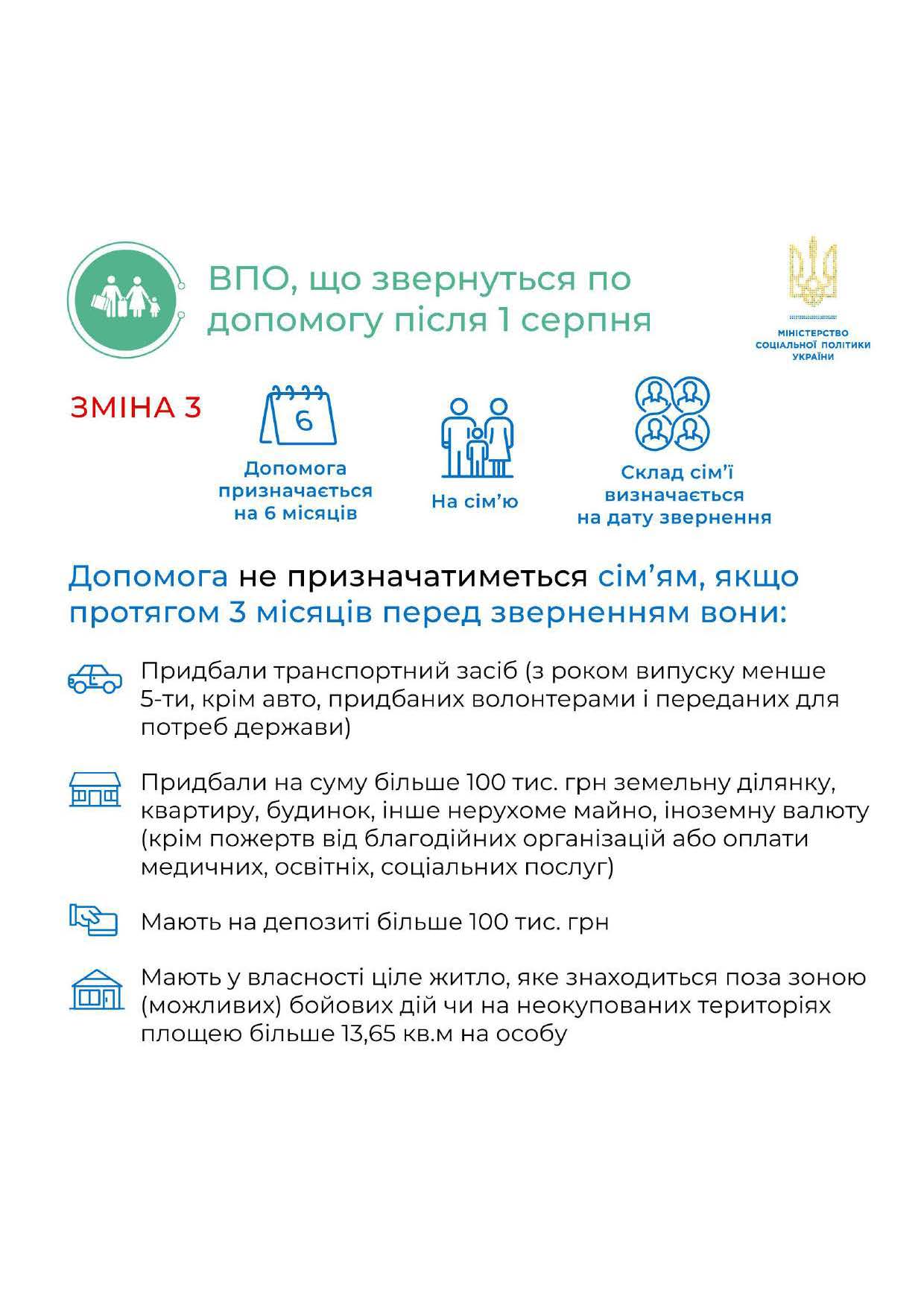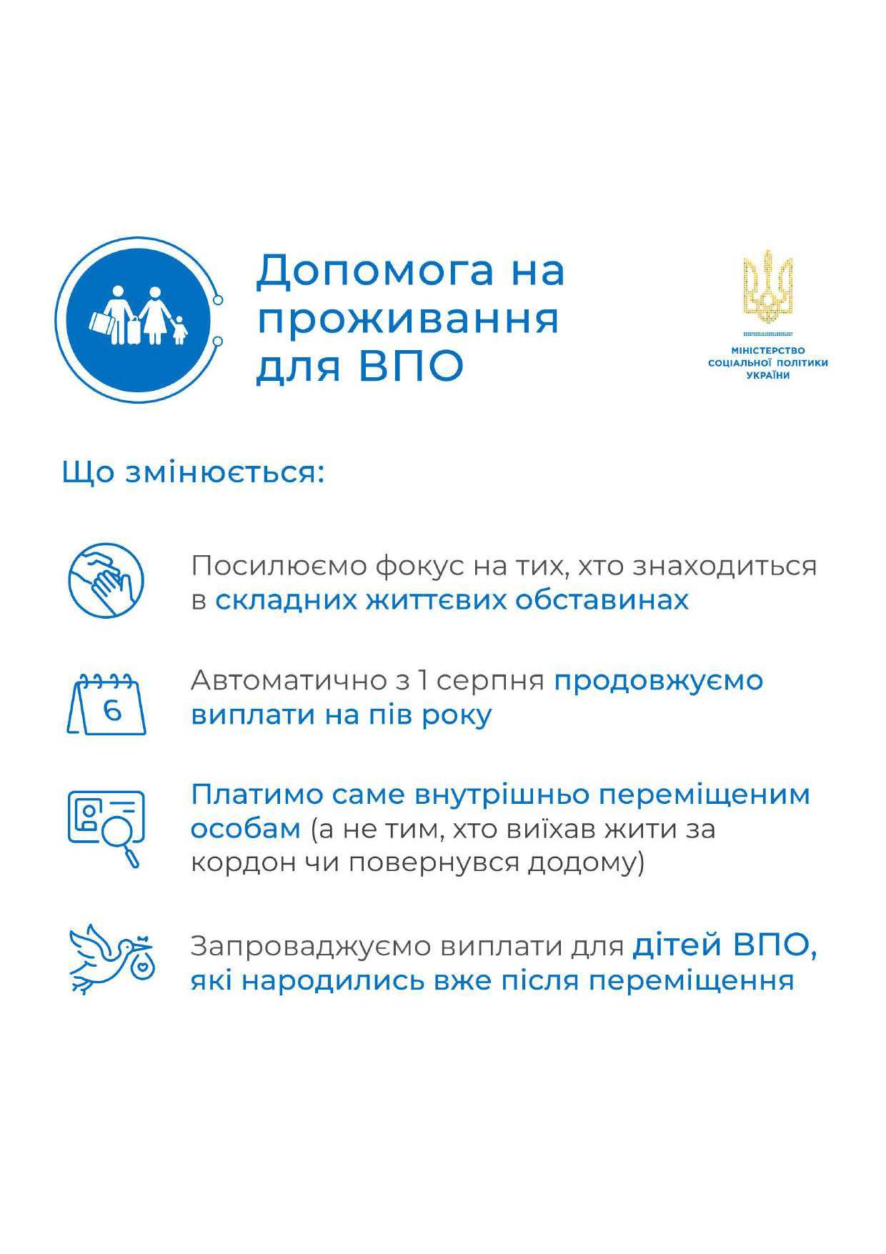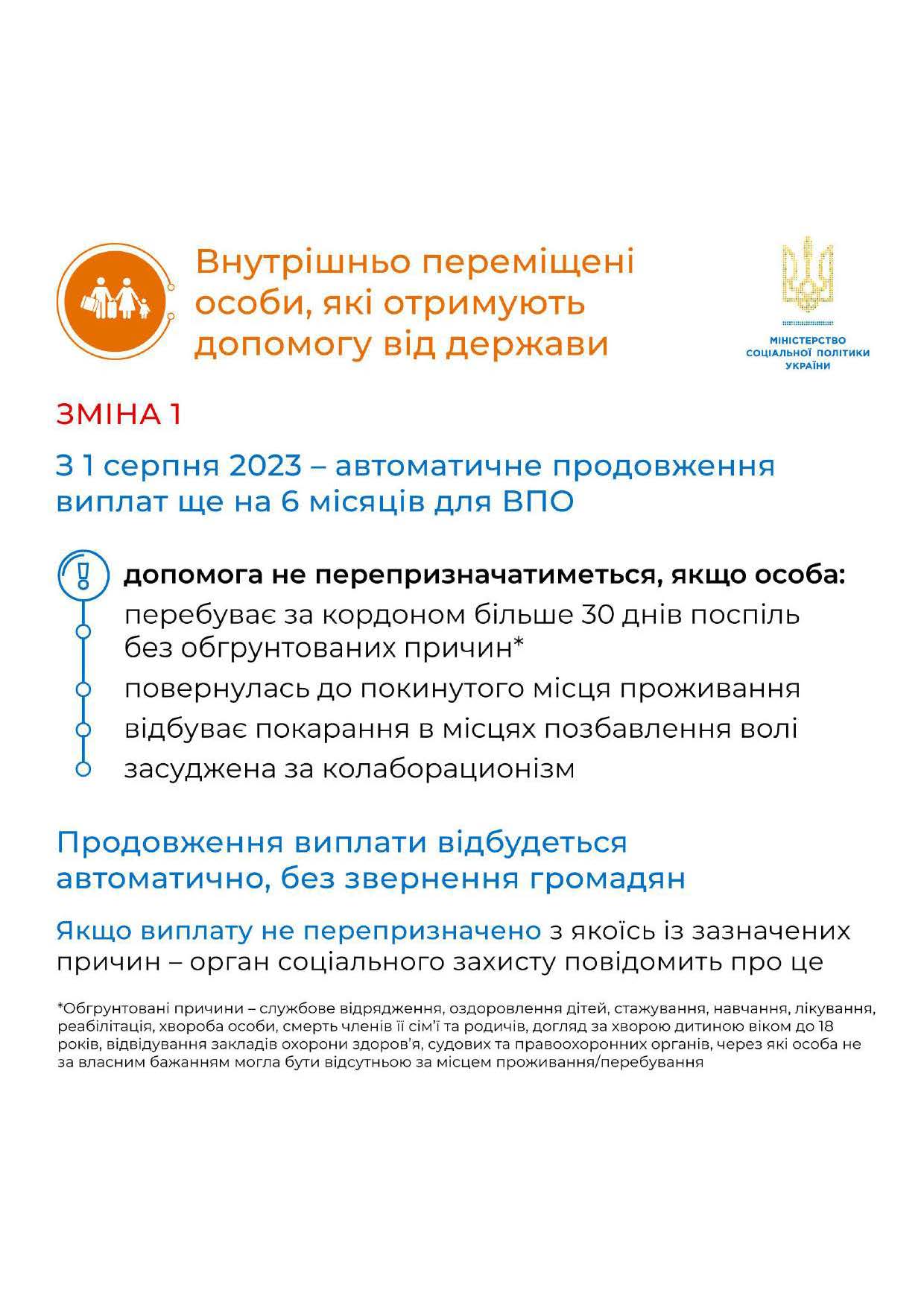 Для всіх внутрішньо переміщених осіб, які отримують допомогу зараз, з 1 серпня 2023 р. буде автоматично продовжено виплату допомоги ще на 6 міс., до кінця січня 2024 р.
