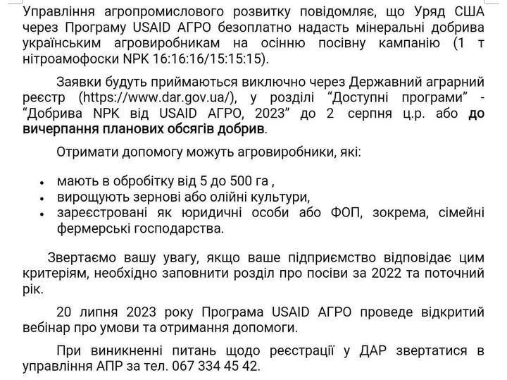 За підтримки Міністерства з аграрної політики та продовольства України реєстрація на отримання допомоги вже розпочалася в Державному аграрному реєстрі (ДАР). Заявки приймаються виключно через ДАР, у розділі “Доступні програми” - “Добрива NPK від USAID АГРО, 2023”. Реєстрація буде тривати до вичерпання планових обсягів добрив. Отримати допомогу можуть агровиробники, які: