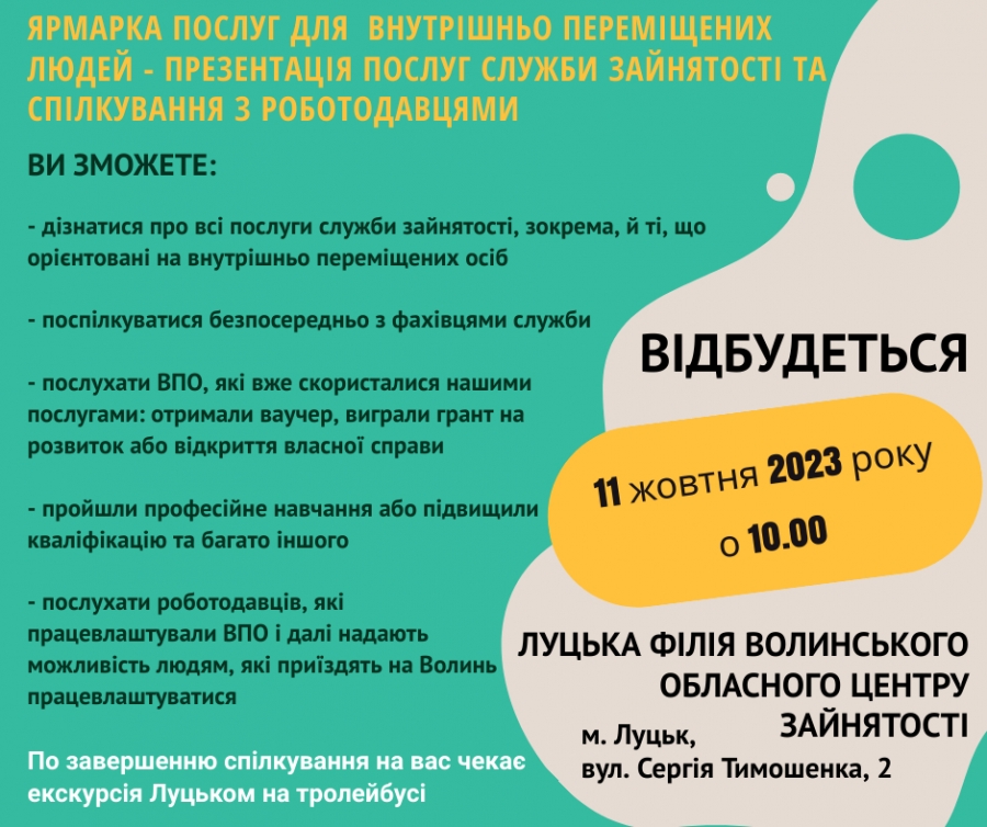 Локація: Луцька філія Волинського обласного центру зайнятостіЧас: 11 жовтня 2023 року, 10.00