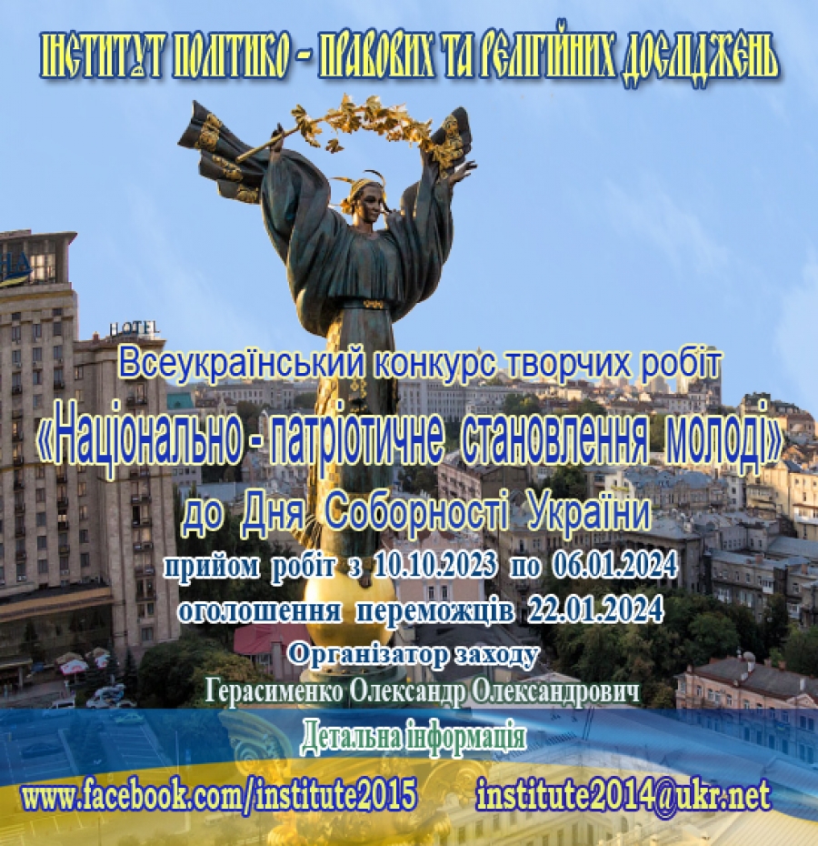 Всеукраїнський конкурс творчих робіт «Національно-патріотичне становлення молоді» з нагоди відзначення Дня Соборності України (далі – Конкурс) проводиться Інститутом політико-правових та релігійних досліджень за підтримки: