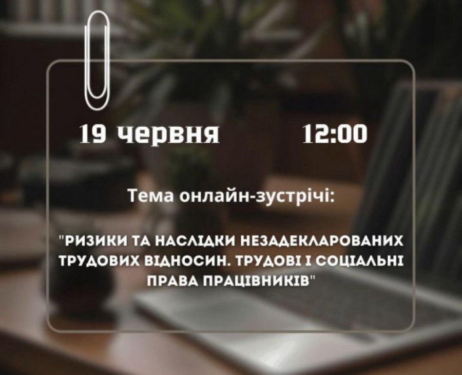 Форма для реєстрації: https://forms.gle/xJ5vAYE2ZncHjVju9. Тема: «Ризики та наслідки незадекларованих трудових відносин. Трудові і соціальні права працівників».