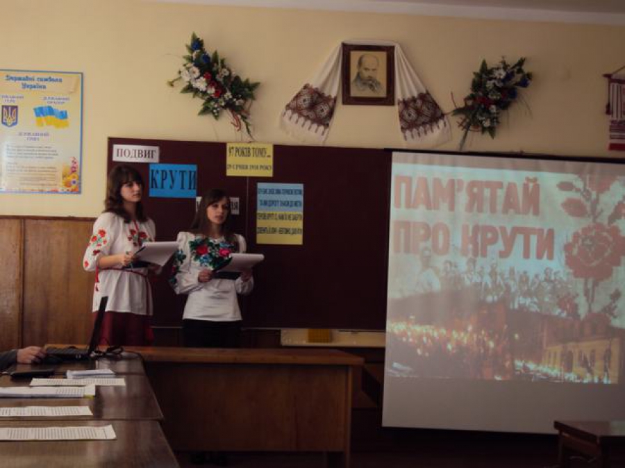 Захід розпочався з хвилини мовчання за полеглими бійцями за волю і незалежність України. Перед початком дискусії учасники засідання переглянули фільм «Легенда про студентське військо», який нагадав присутнім про трагічні події, які відбулись у 1918 році на залізничній станції Крути. Під час обговорення учнями була проведена паралель з сьогоденням, так як цей подвиг 300 студентів є прикладом патріотизму, героїзму та самовідданості, які сьогодні демонструють наші бійці на сході країни.