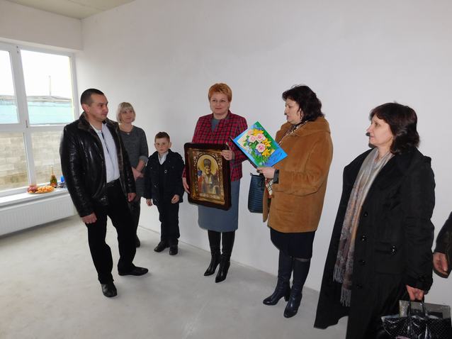 Подарунки вручили керівники виконавчої гілки влади та місцевого самоврядування, а представники забудовника подарували побутову техніку для кухні.
