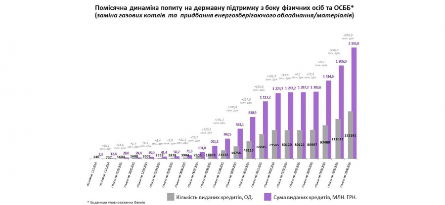 Лише за місяць населенню та ОСББ на придбання «негазових» котлів, енергоефективного обладнання й матеріалів видано 21180 «теплих» кредитів на суму 350 млн гривень. З них малозабезпечені родини залучили 221 млн гривень на покупку енергоефективних продуктів, що становить 14 989 кредитів.
