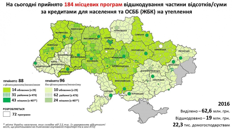 Так, завдяки ініціативі Держенергоефективності у 2016 році прийнято 184 місцеві програми, за якими відшкодовується частина відсотків чи суми "теплого" кредиту. Зокрема, прийнято 24 обласні програми, дія яких поширюється на всі райони та міста відповідного регіону (у тому числі обласний центр). Додатково у цих регіонах запроваджено 93 районні та 67 міських програм.