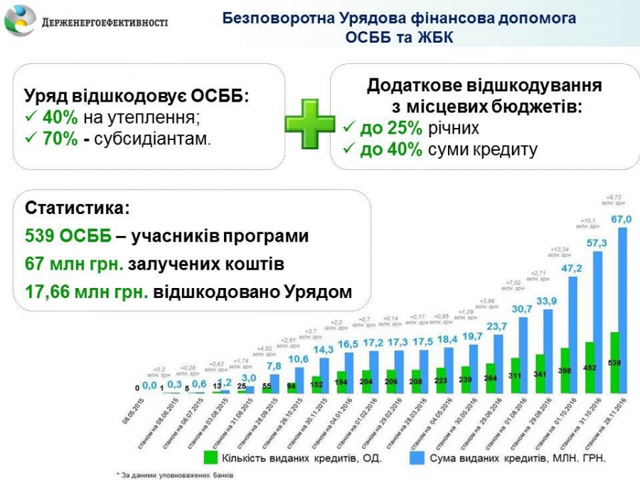 Загалом, з початку дії програми нею скористалося вже 539 ОСББ, які залучили 67 млн. грн на заходи з економії енергоресурсів та підвищення комфортних умов проживання.