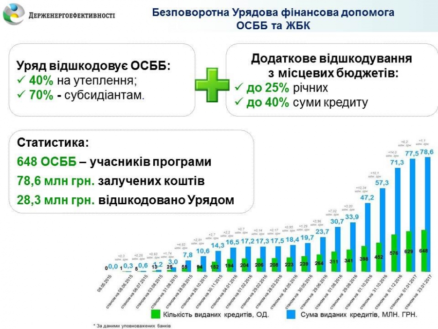 "Лише за три тижні січня вже 19 ОСББ долучилися до програми та залучили на енергоефективні заходи більше 1,1 млн. грн, що у півтора рази більше ніж за весь січень-місяць 2016 року", - зауважив Голова Агентства – "Зважаючи на стрімкий ріст популярності програми серед ОСББ восени минулого року та позитивну динаміку попиту на початку 2017 року, можемо зробимо логічний висновок: програма фінансової допомоги отримає ще більше прихильників ніж торік".