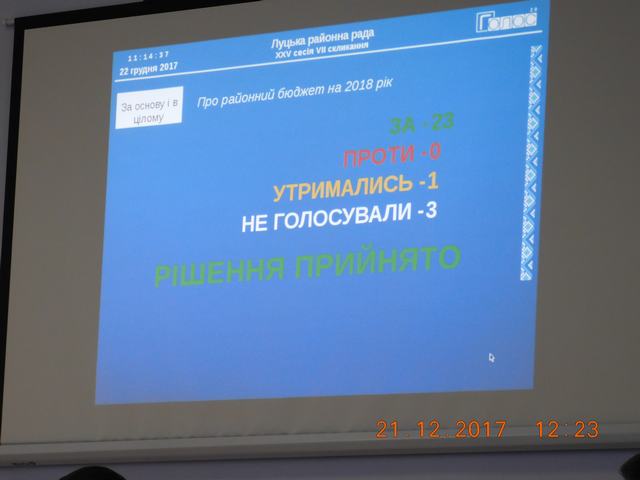 22 грудня 2017 року відбулось пленарне засідання двадцять п’ятої позачергової сесії Луцької районної ради 7 скликання. У сесійній залі зареєструвалось 27 депутатів із 34. Участь у засіданні сесії взяли голова районної державної адміністрації Ігор Ярмольський і його заступники Володимир Боярчук та Інна Бас, окремі керівники районних установ та організацій, представники ЗМІ.