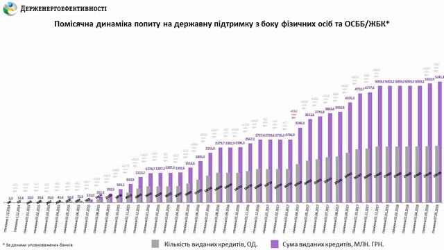 на утеплення індивідуального житла – 2090 кредитів на суму близько 68 млн грн.; на енергоефективні заходи в ОСББ та ЖБК – 32 кредити на суму близько 10 млн грн.; на придбання твердопаливних котлів - 56 кредитів на суму майже 2 млн гривень.