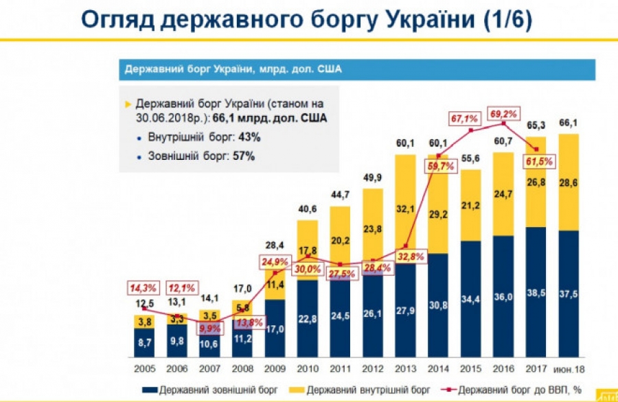 Незважаючи на проведення у 2015 році реструктуризації державного та гарантованого державою зовнішнього боргу, значний борговий тягар, що накопичений у попередні роки, продовжує створювати навантаження на державний бюджет. Зокрема, у період з 2007 р по 2010 р державний борг України зріс на $26,5 млрд, з 2010 р по 2014 р – ще на $19,5 млрд грн. Для порівняння, за три роки, з 2014 р до 2017 р державний борг збільшився на $5,2 млрд. Крім того, за результатами минулого року держборг вперше за останні три роки наблизився до безпечного значення, визначеного у Бюджетному кодексі – 60% ВВП. Зараз пільгове фінансування в структурі державного боргу України складає 26%, що демонструє високий ступінь підтримки України міжнародними партнерами.