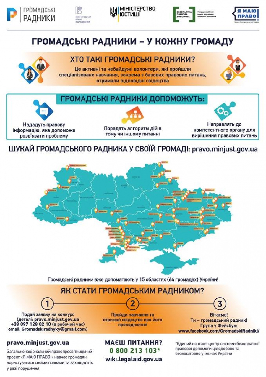 Громадські радники - це активні та небайдужі волонтери, які пройшли навчання з базових правових питань отримали відповідні свідоцтва.