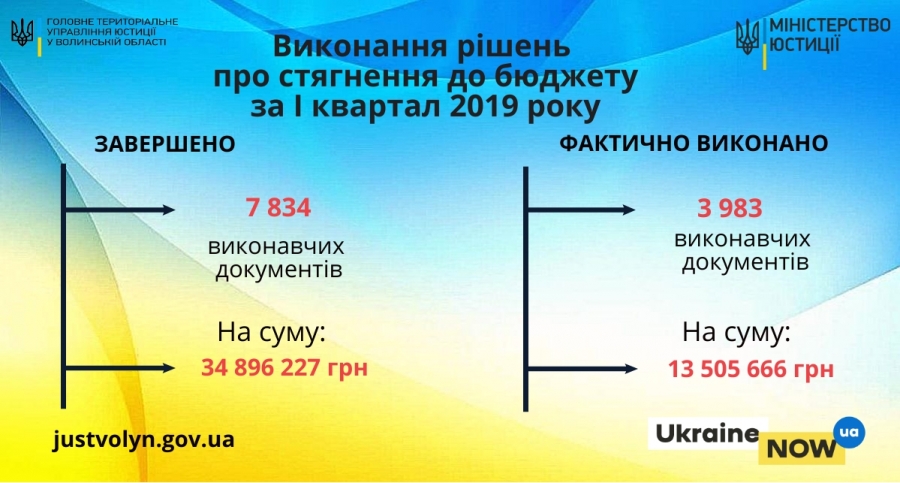 Друзі! Хочемо поділитися з Вами результатами роботи працівників ДВС Волині протягом 3 місяців 2019 року щодо стягнення коштів до бюджету. Всього за січень-березень 2019 року державним виконавцям територіальних органів ДВС Головного територіального управління юстиції у Волинській області підлягало виконанню 34 115 виконавчих документів про стягнення до бюджету, суми стягнення за ними становили 558 269 166 грн. За результатами проведеної роботи протягом І кварталу 2019 року державними виконавцями завершено 7 834 виконавчих документи, що становить 23,0%, на загальну суму 34 896 227 грн. У тому числі у зв'язку із повним фактичним виконанням протягом звітного періоду державними виконавцями області закінчено 3 983 виконавчих документи, що становить 50,8% від завершених виконавчих документів та всього стягнуто на користь стягувачів 13 505 666 грн.