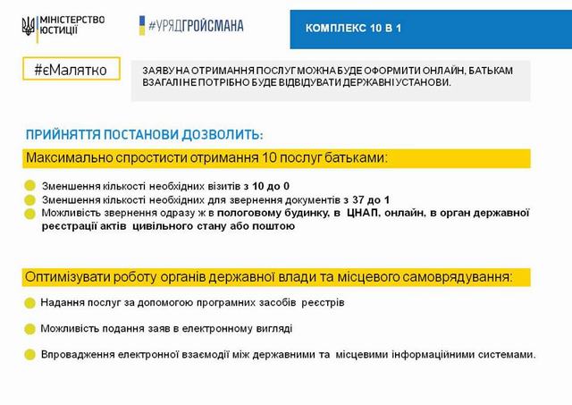 Урядова ініціатива #єМалятко дозволить вже з 1 січня 2020 року отримати батькам комплексну послугу «єМалятко», яка об’єднає одразу 9 сервісів: