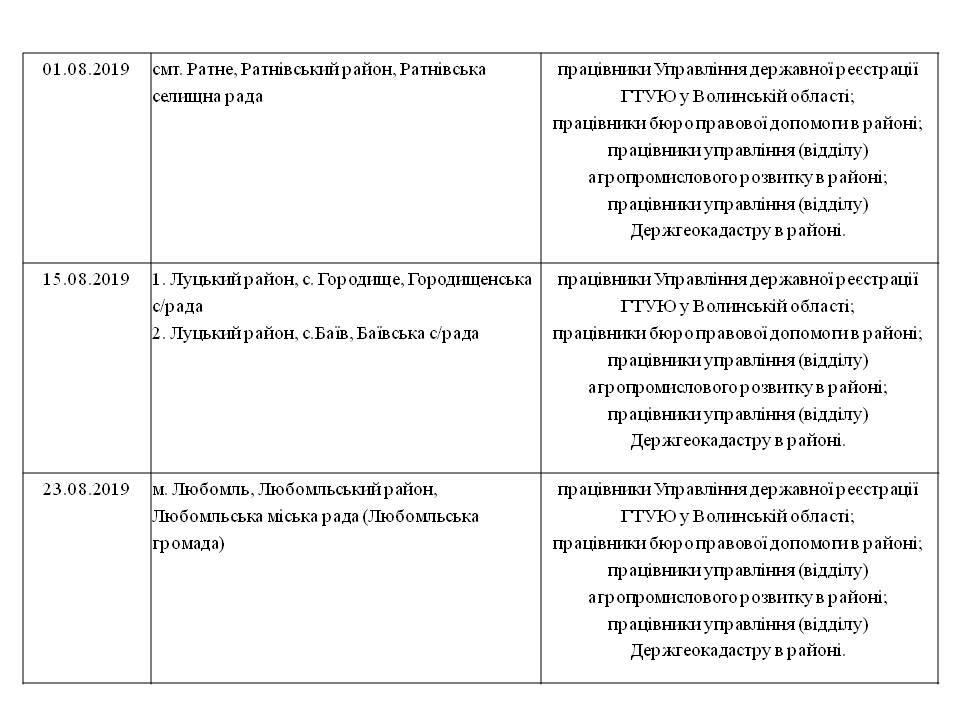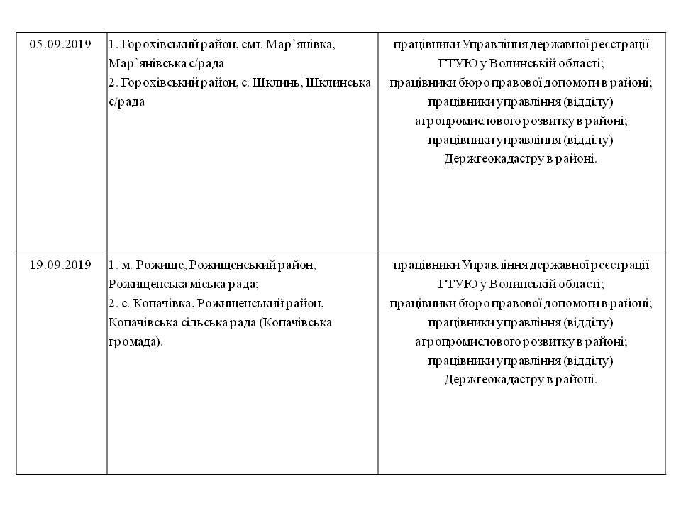 За ініціативи Міністерства юстиції України в період з 15.07.2019 по 30.09.2019 відновлено роботу мобільних точок доступу до системи безоплатної правової допомоги в тому числі щодо захисту речових прав на землі сільськогосподарського призначення.Пропонуємо ознайомитись із графіком виїздів мобільних груп по населених пунктах Волинської області.