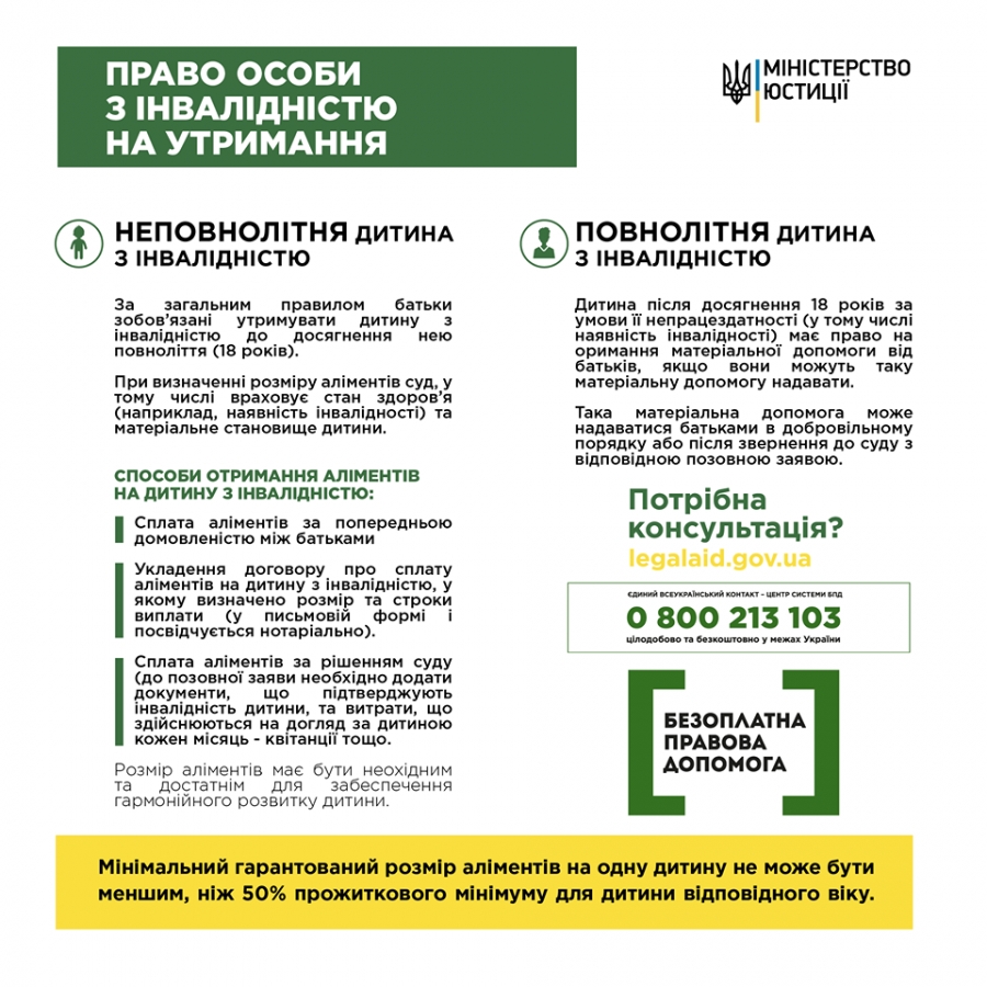 #Аліменти – це утримання, яке у визначених законом або договором випадках надається одним членом сім’ї іншому, якщо останній не має власних коштів для існування.✅ Право на аліменти особа з інвалідністю має як неповнолітня або повнолітня дитина, батько чи мати, а також як чоловік чи дружина.❗Крім того, необхідно пам'ятати, що поряд з правом на утримання, особа з інвалідністю також може мати обов'язок сплачувати аліменти іншим особам.