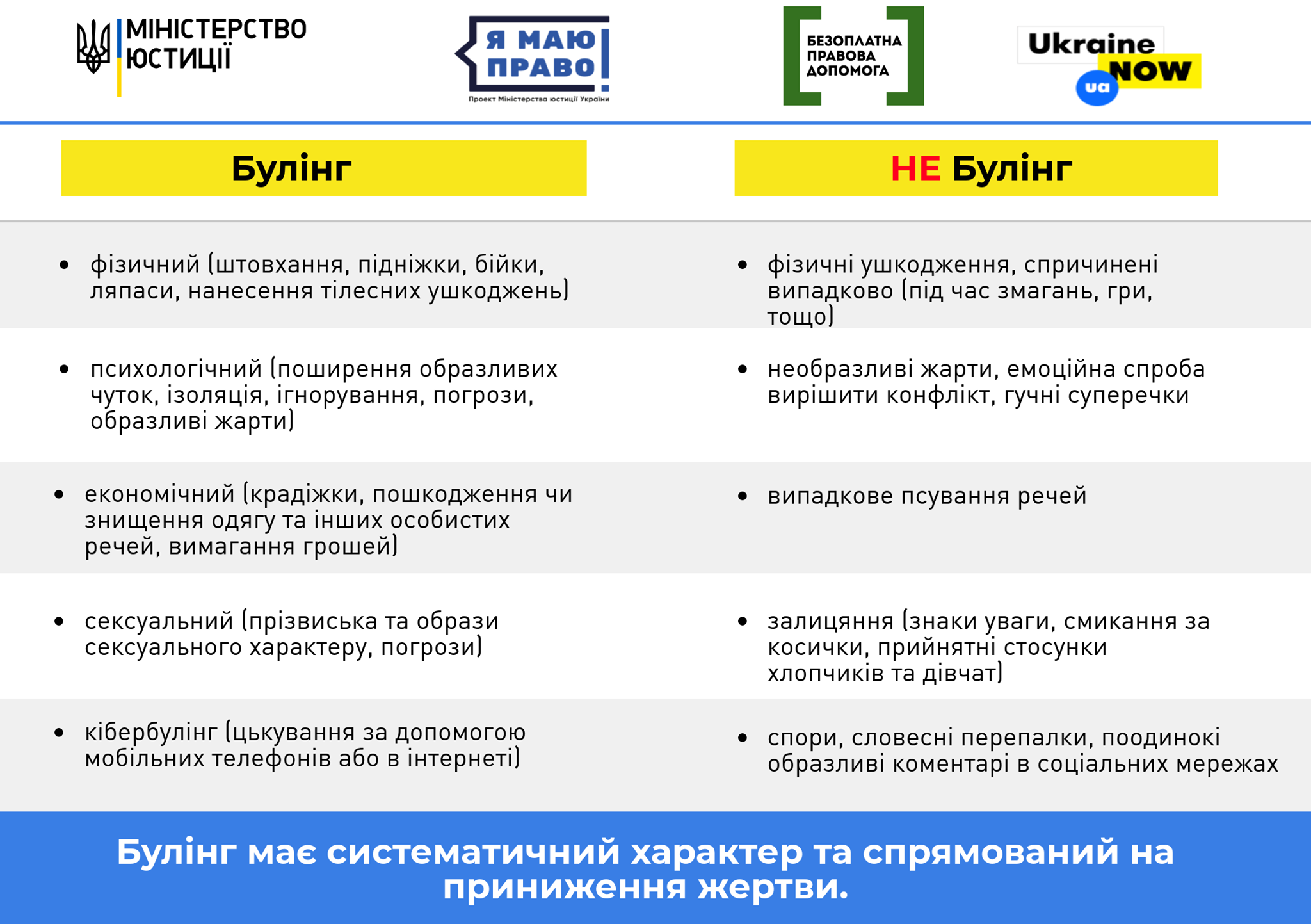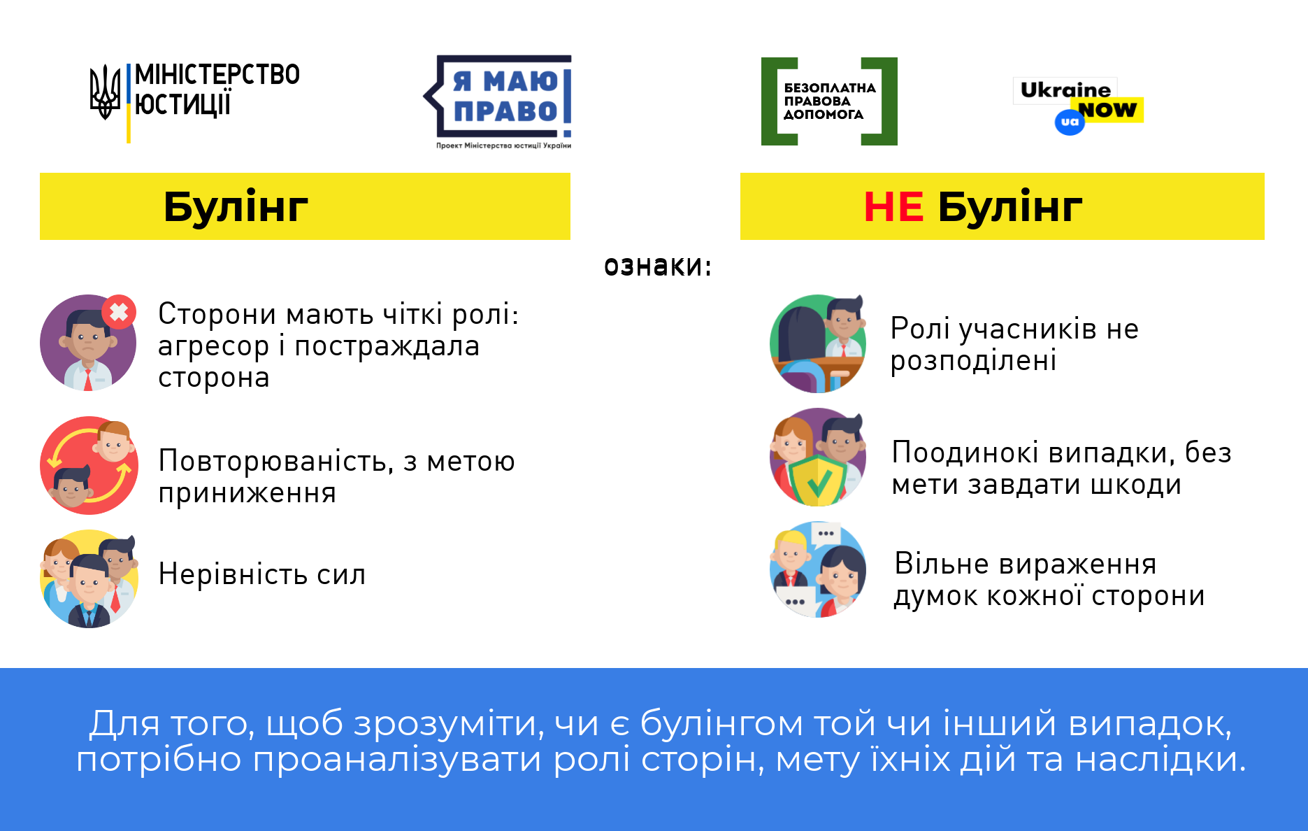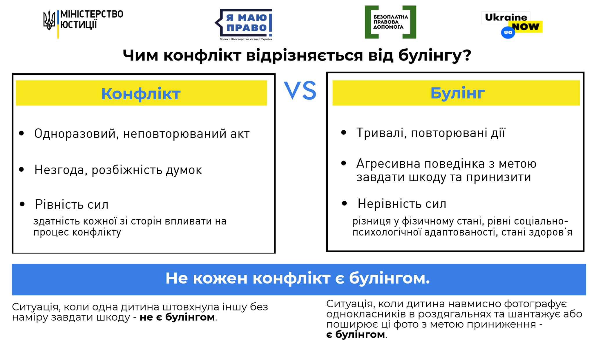 Часом спостерігається надмірне реагування батьків на простий конфлікт чиз’ясування стосунків між учнями, в той час, як ознак цькування в нихнемає.Щоб було легше відмежувати булінг від інших ситуацій, ми підготувалидекілька інформаційних карток, в яких визначено основні відмінностібулінгу від конфлікту та інших випадків, які можуть виникати міжучасниками освітнього процесу. Давайте разом розберемось, що таке булінгта як його вирізнити з-поміж інших ситуацій.До речі, вже з понеділка стартує Всеукраїнський тиждень з протидіїбулінгу