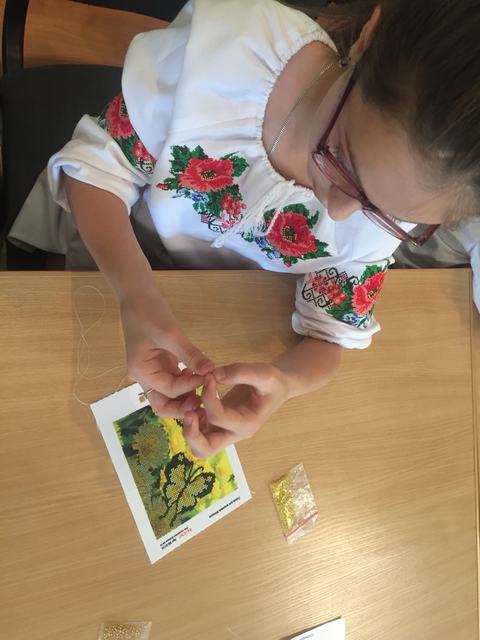 Мар’яна Шелест, яка більше 3 років займається цим видом мистецтва, розповіла про те, як починала вишивати, скільки має робіт, ознайомила з асортиментом бісеру, як краще підібрати кольорову гамму. Усі з присутніх мали змогу самостійно спробувати вишивати, адже вироби своїми руками найгарніші.