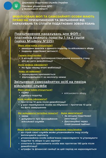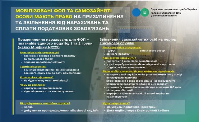 Державна податкова служба України інформує, що мобілізовані ФОП та самозайняті особи мають право на призупинення та звільнення від нарахувань і сплати податкових зобов’язань.