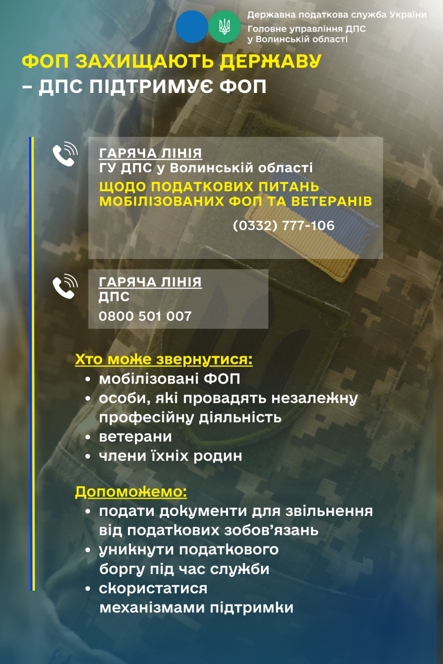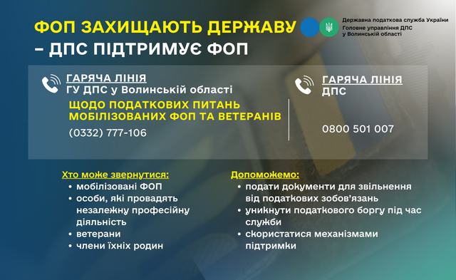 Фахівці ГУ ДПС у Волинській області повідомляють, що для підтримки мобілізованих та демобілізованих ФОП, почали роботу «гарячі лінії».